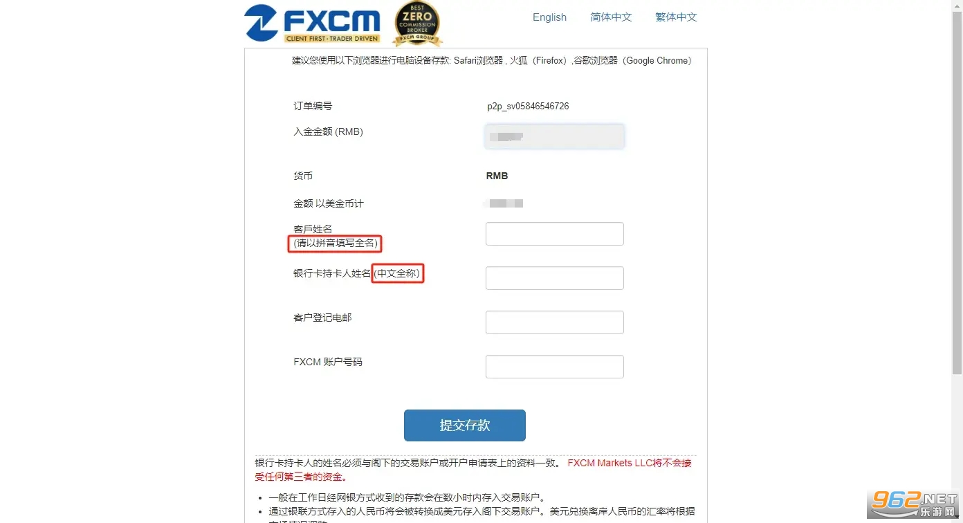 此页面供应的网银通道账户会不按期更改,请勿反复利用前次入金的网银通道账户。每次入金必要以暂时MYFXCM显示的网银通道账户为准。如转账至逾期网银通道账户,则必要抢先7个职业日查找并退还资金。
