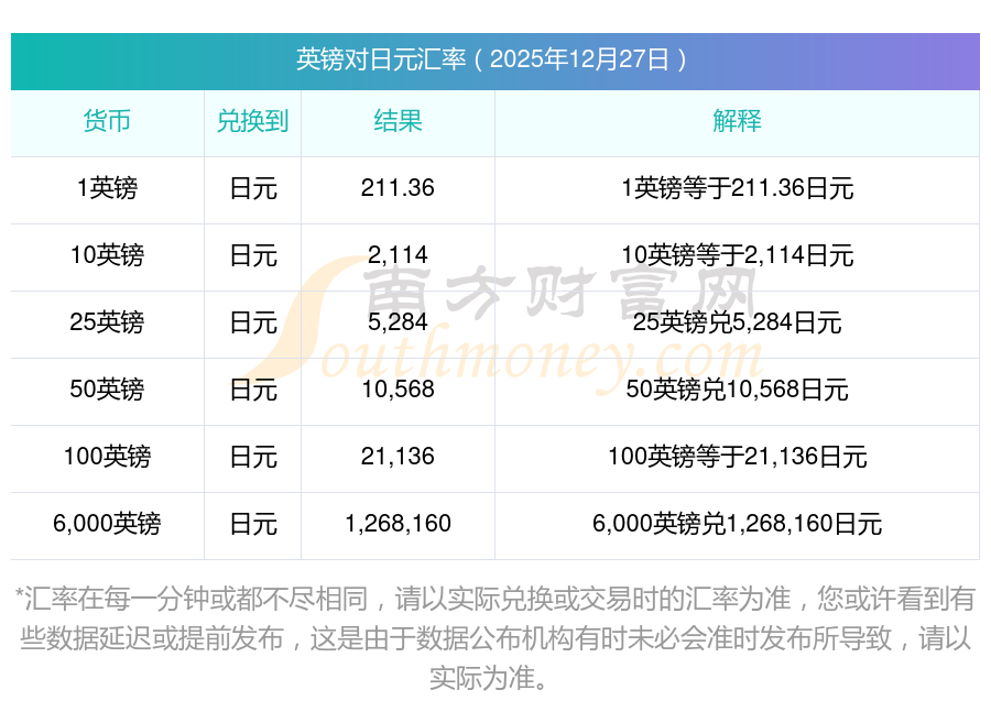 英镑对日币开盘价众少?本日136英镑兑日币汇率又是众少?2025/12/27