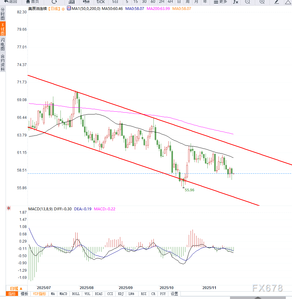 目今WTI正在58美元左近颤动,靠拢前期低点支柱区域,若有用跌破该职位,也许进一步下探至55美元一带;而上方阻力则合心60美元整数合口及5日均线压制。