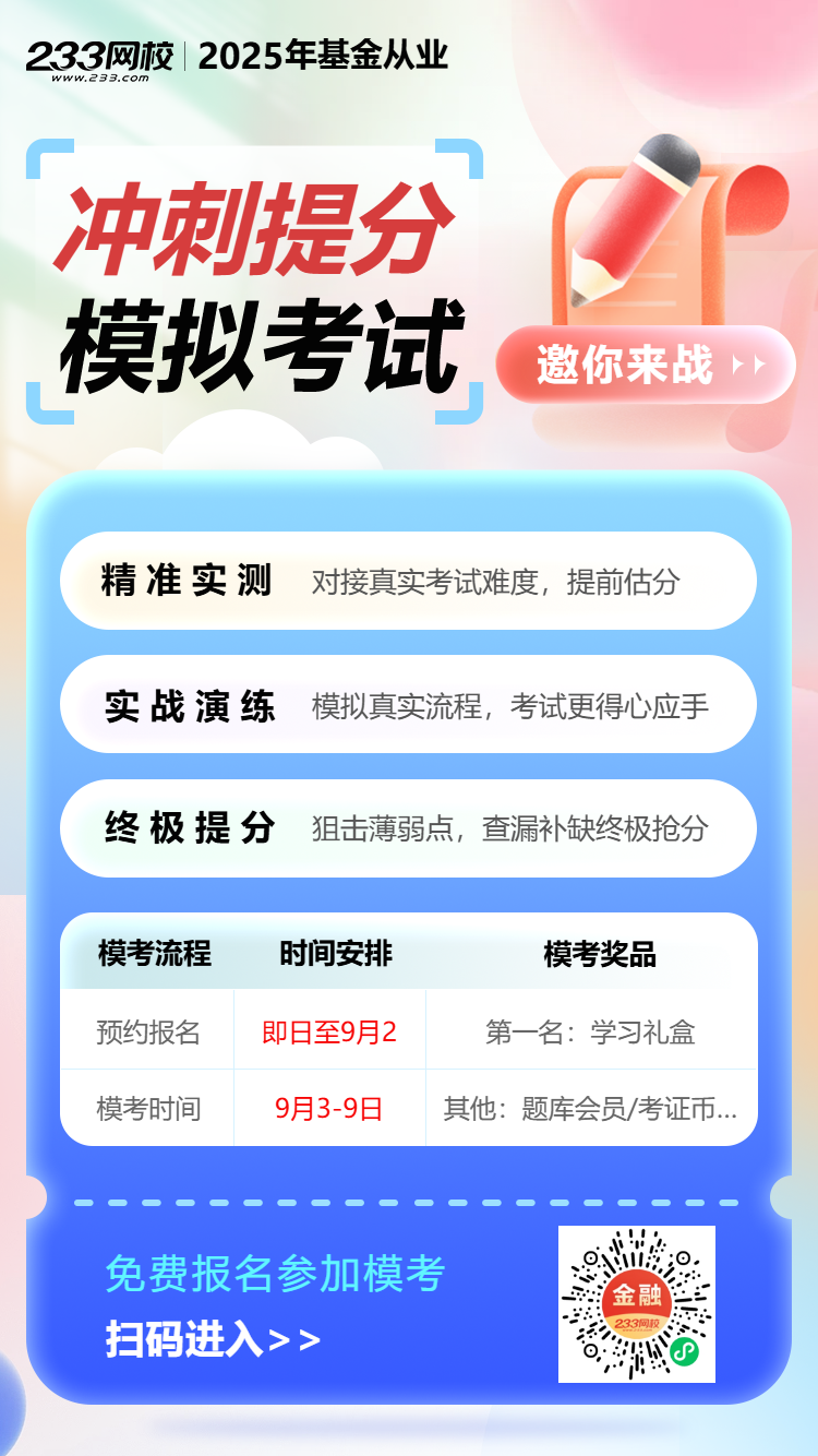 指数投资框架还有机会赢取奖品2025年9月基金从业专场考察越来越近,你还正在为刷什么题烦恼吗?9月基金【冲刺提分】模考大赛来了,疾来检测一下温习恶果吧!遭遇疑义还可能进入锻练营群正在线商量专业教师,让你备考不留疑义!