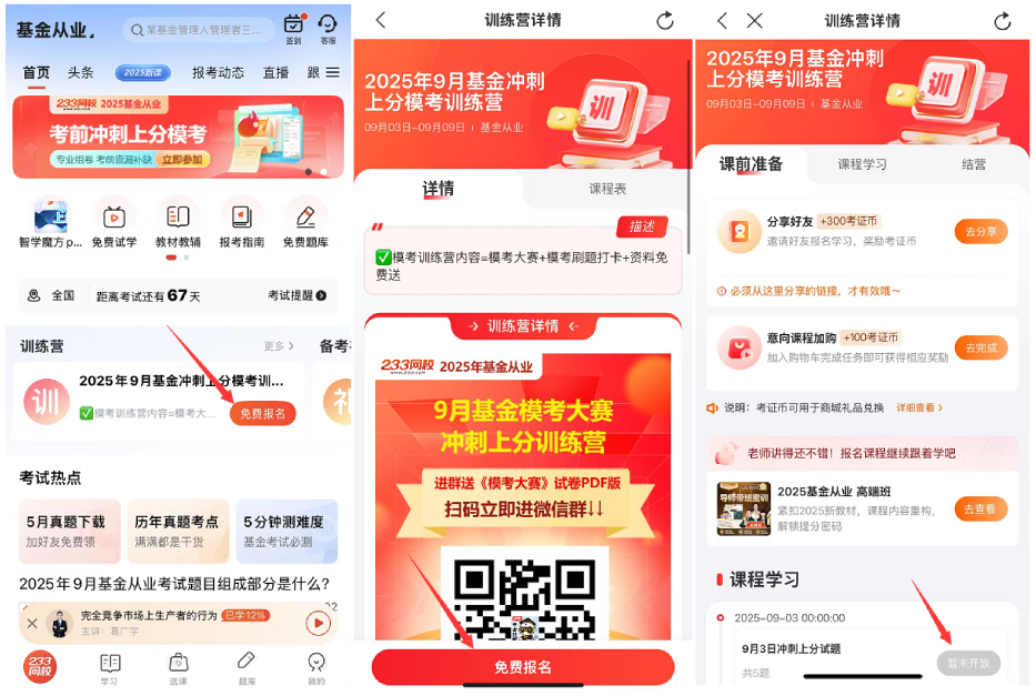 step1:进入233网校APP(可直接下图扫码下载233网校APP)--拣选“基金从业”--拣选“锻练营”--点击“免费报名”。