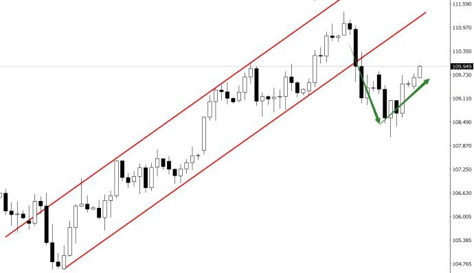 而是需要到小周期上去分析和确认-mt4外汇开户下图是美元/日元(USDJPY)天图。从天图上能够看到行情正在前期变成了上升通道,随后触顶并向下冲破通道,冲破后又伸开了当今的反弹走势。这是一个身手上程序的通道冲破,回抽确认走势。