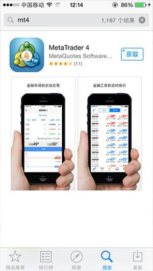 2、点击下方的“查找”输入“MT4”并实行查找选拔“MetaTrade 4”点击“获取”