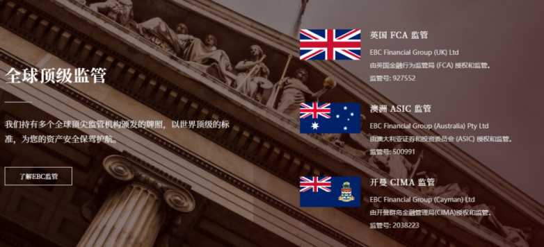 以我正正在买卖的EBC平台为例,他具有三大顶级禁锢执照,英邦FCA的禁锢号是927552,澳洲ASIC的禁锢号是500991,开曼CIMA的禁锢号是2038223,每一个执照都有禁锢号。