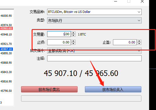 第一步,登录MT5往还软件,点击BTC/USD(比特币兑美元)这个泉币对,选拔新订单。