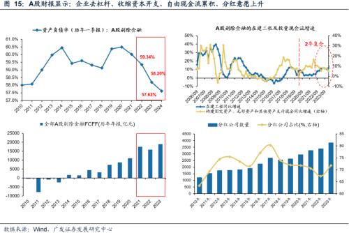 邦内经济底层根源蜕化的历程中,2020年往后A股上市公司的行动也悄悄爆发改观:资产欠债率降低→本钱开支及营运开支缩小→自正在现金流累积→分红比例提拔(23年年报因分红预案还未充实分红,所以察看分红公司数目占比提拔)。