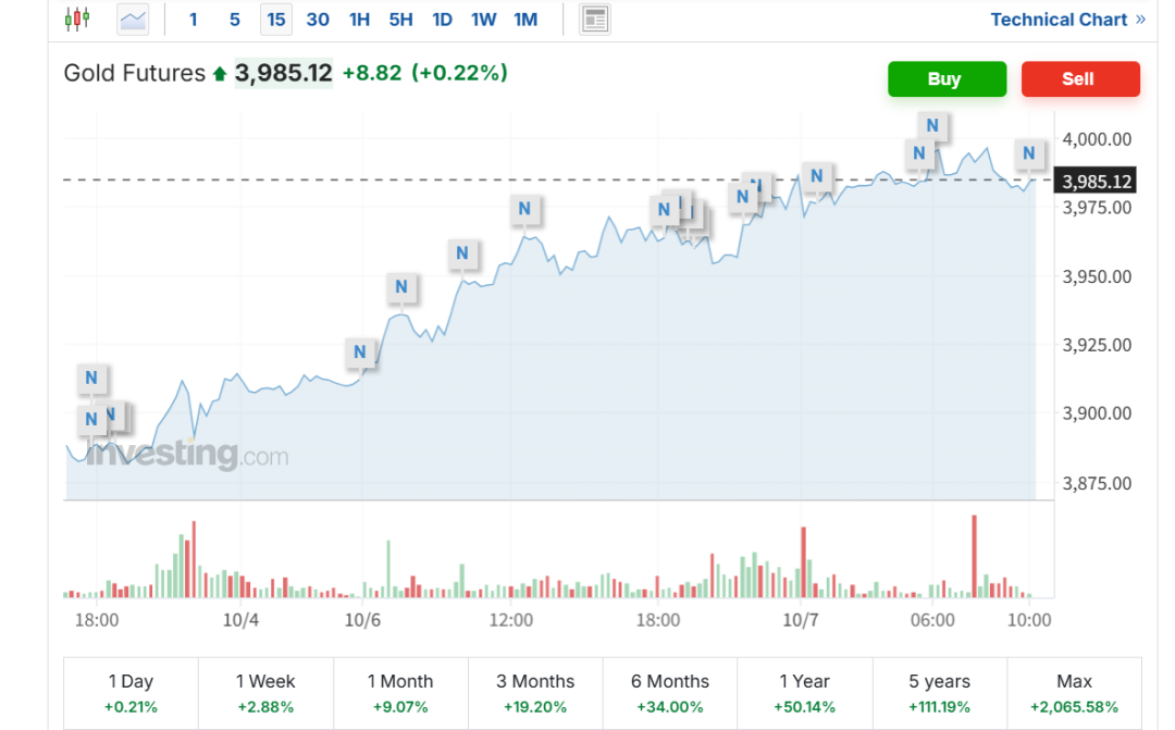 10月7日,亚太墟市早盘,纽约期金涨至4000美元/盎司整数位心情合口,创史册新高。随后,金价有所回落,但仍正在高位振动。