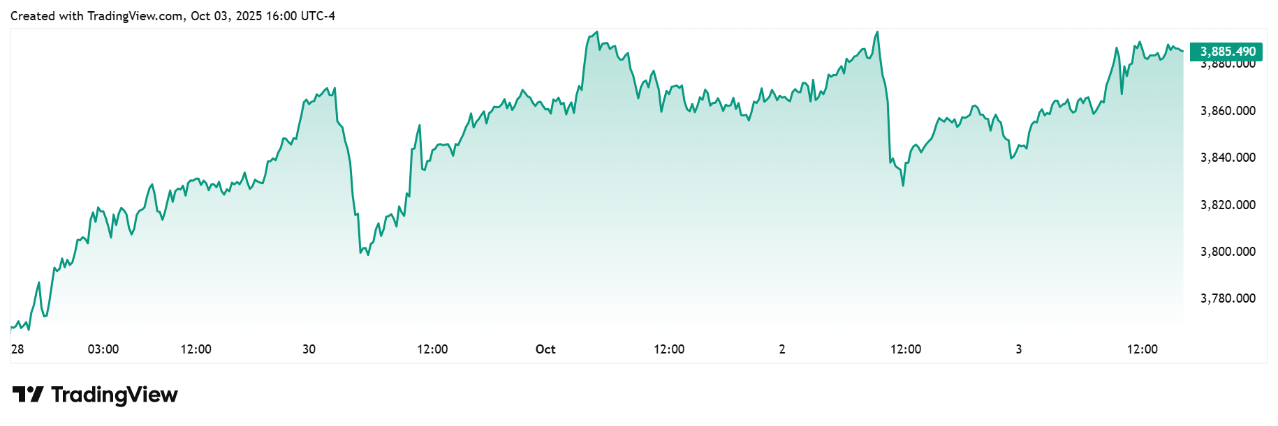 但美邦往还者信仰踌躇,金价于午后 11:45(东部年光)再度暴跌至 3,828 美元/盎司。至北美收盘,金价已接受对折跌幅,正在 3,857 美元 左近守住维持。进入周四亚洲时段,金价短暂下探至 3,840 美元,随后张开本周结尾一波冲高,至北美开盘为止一同攀升至 3,887 美元/盎司,最高触及 3,892 美元,最终正在 3,880 众美元 区间终止全周往还。