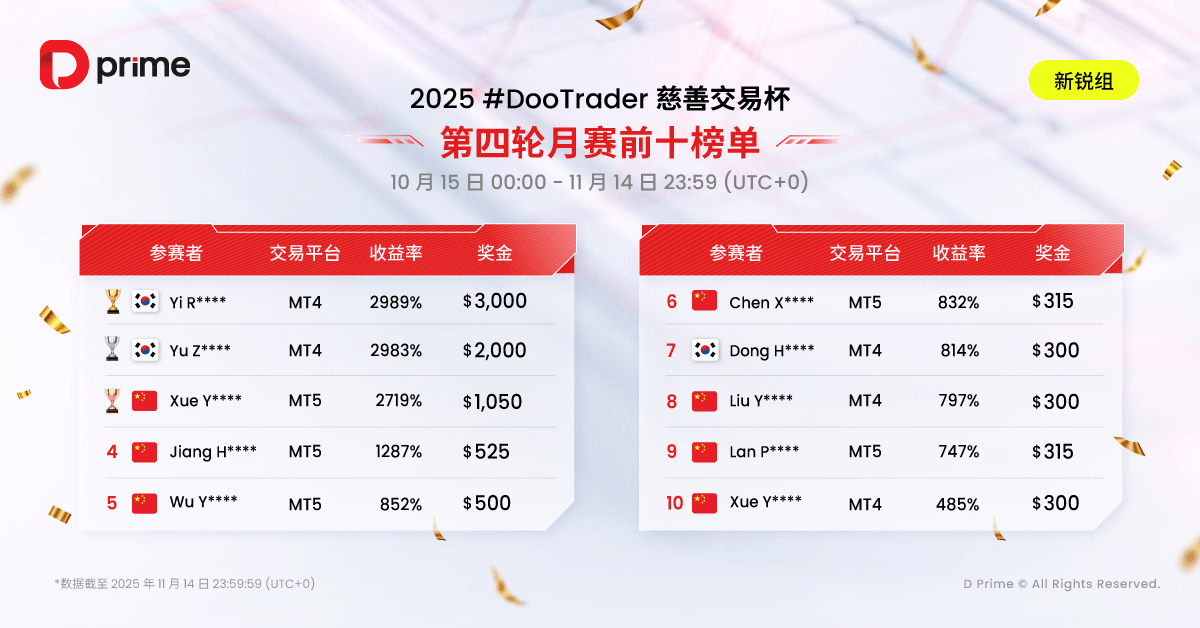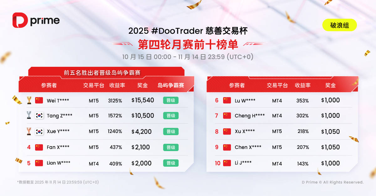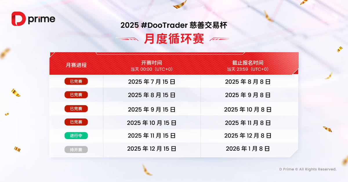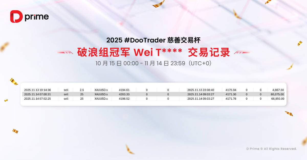 值得合心的是,2025 #DooTrader 慈善杯交往杯不但是一场比试,更是一个转达爱心的公益行径。每当您正在角逐中竣事 1 手交往,D Prime 都将代外您捐出 0.1 美元,助助改革艰苦儿童的训诫前提,让您的每一笔交往助力点亮更众孩子的他日。