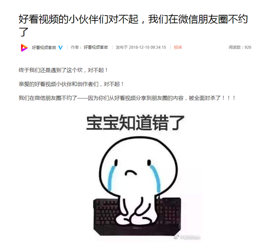 封完头条封百度?百度好看视频内容在朋友圈被全面封杀12月10日,百度悦目视频正在官方微博上发文《悦目视频的小伙伴们对不起,咱们正在微信好友圈不约了》,称其产物分享至微信好友圈的实质已被全部封杀。