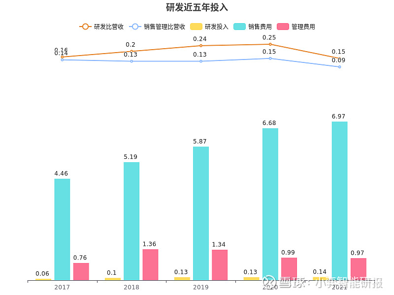近五年,周大生研发进入不足出卖和处置用度,近五年研发进入为5536.80万,研发占贸易收入比率从2017年的0.16%下降到2021年0.15%。