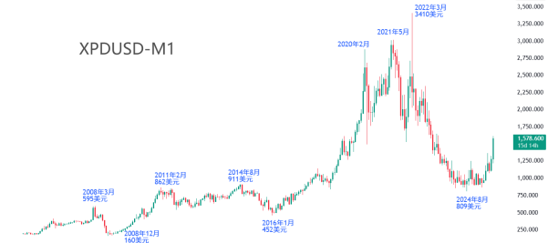 2022年3月至2024年8月,钯金代价从最高点接续暴跌,最低跌至809美元,累计最大跌幅76%,震恐商场。因为钯金代价过高,修设商选拔同时间代价更低廉的钯金动作催化转化器的合键质料,这导致钯金的需求大降。别的,汽车商场从燃油车向新能源车的转嫁,也弱小了钯金的需求面。各种要素配合效率,促成了钯金代价正在2022年至2024年的大跌。