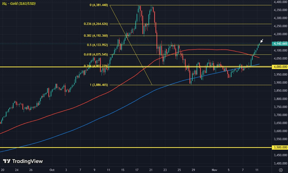 目前金价的上涨使其寻事10月底跌势的50%斐波那契回调位。此前金价从约4,350美元暴跌逾10%至3,900美元左近,而今已反弹约6%。