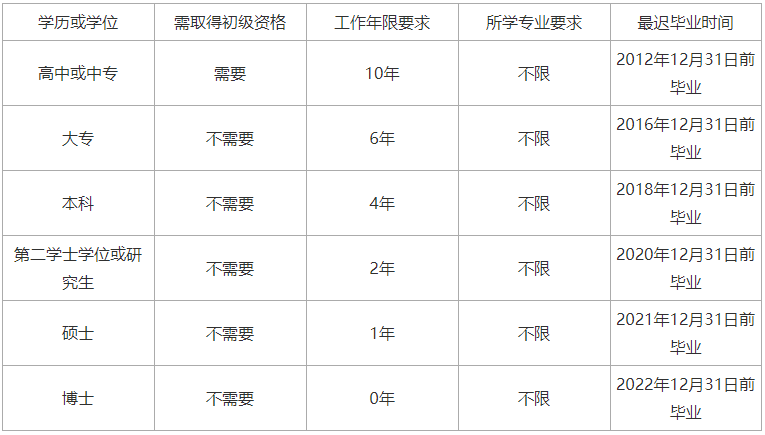 (六)以上报名要求中,相闭学历或学位的请求是指经邦度训诲行政部分供认的正道学历或学位。从事相干专业使命年限谋略截止日期为报考当年12月31日,此中从事相干专业使命年限是指赢得规矩学历或学位前后从事该项使命岁月的总和。整天制学历报考职员未结业时候阅历不计入相干专业使命年限。