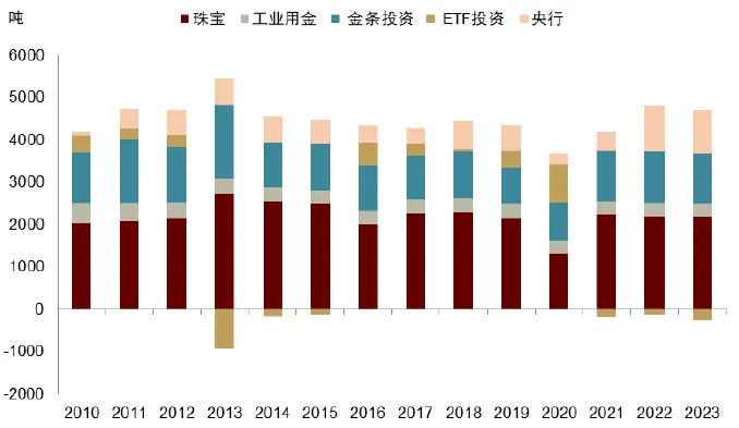 从微观逻辑来看,本质上,对待需求占比拟高的黄金持有者来说,他们持有黄金的时机本钱并非本质利率,或者说,他们是否持有黄金并不太取决于本质利率,譬喻工业用金、央行购金等。后文看到,之是以2003年后金价慢慢滥觞与本质利率明显负相干、金融属性得以深化,一个很紧要的出处是2003年推出了黄金ETF投资,其持有黄金的时机本钱是10年期美债本质利率。2022以后,跟随本质利率大幅上涨,黄金ETF需求大幅低沉,利率不敏锐的央行购金成为了金价最终订价者。那么,谁又肯定央行购金?央行购金潜正在的空间有众大?咱们将正在第三章做具体切磋。