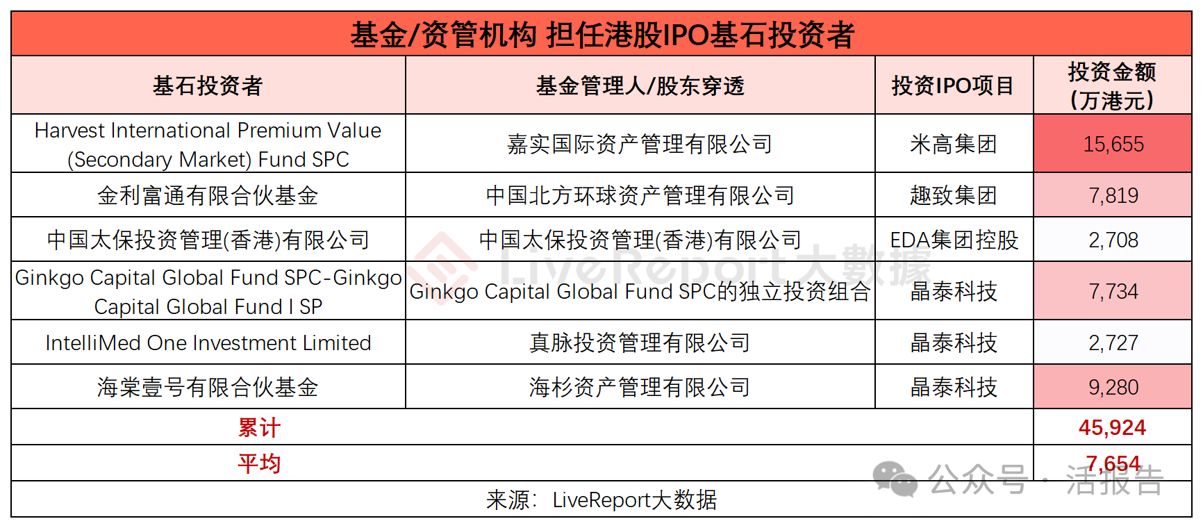 据LiveReport大数据,截至2024年6月4日,6家资产办理机构共出资4.6亿港元,占总基石金额的比例约为17%,均匀每家机构的投资金额为7654万港元。