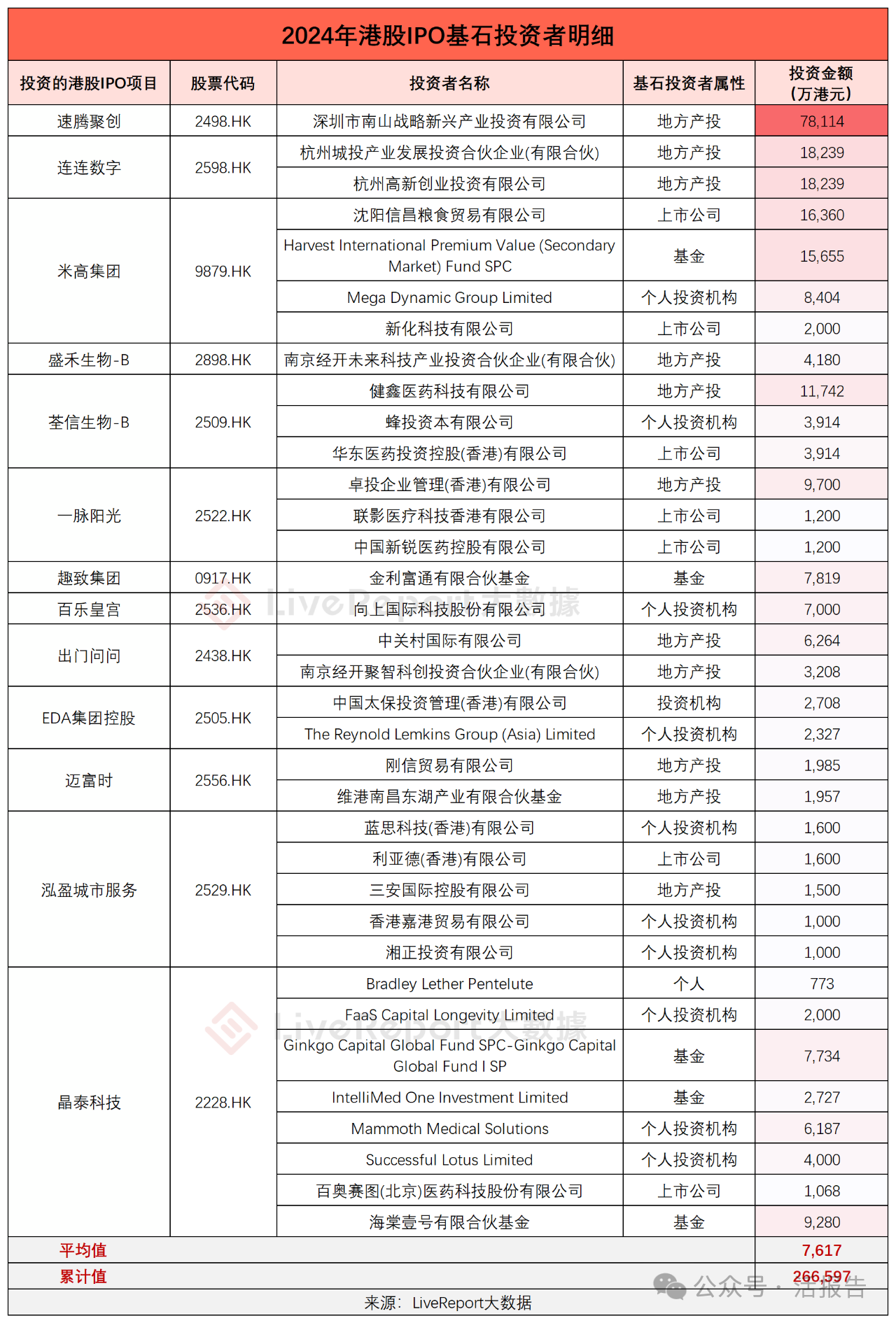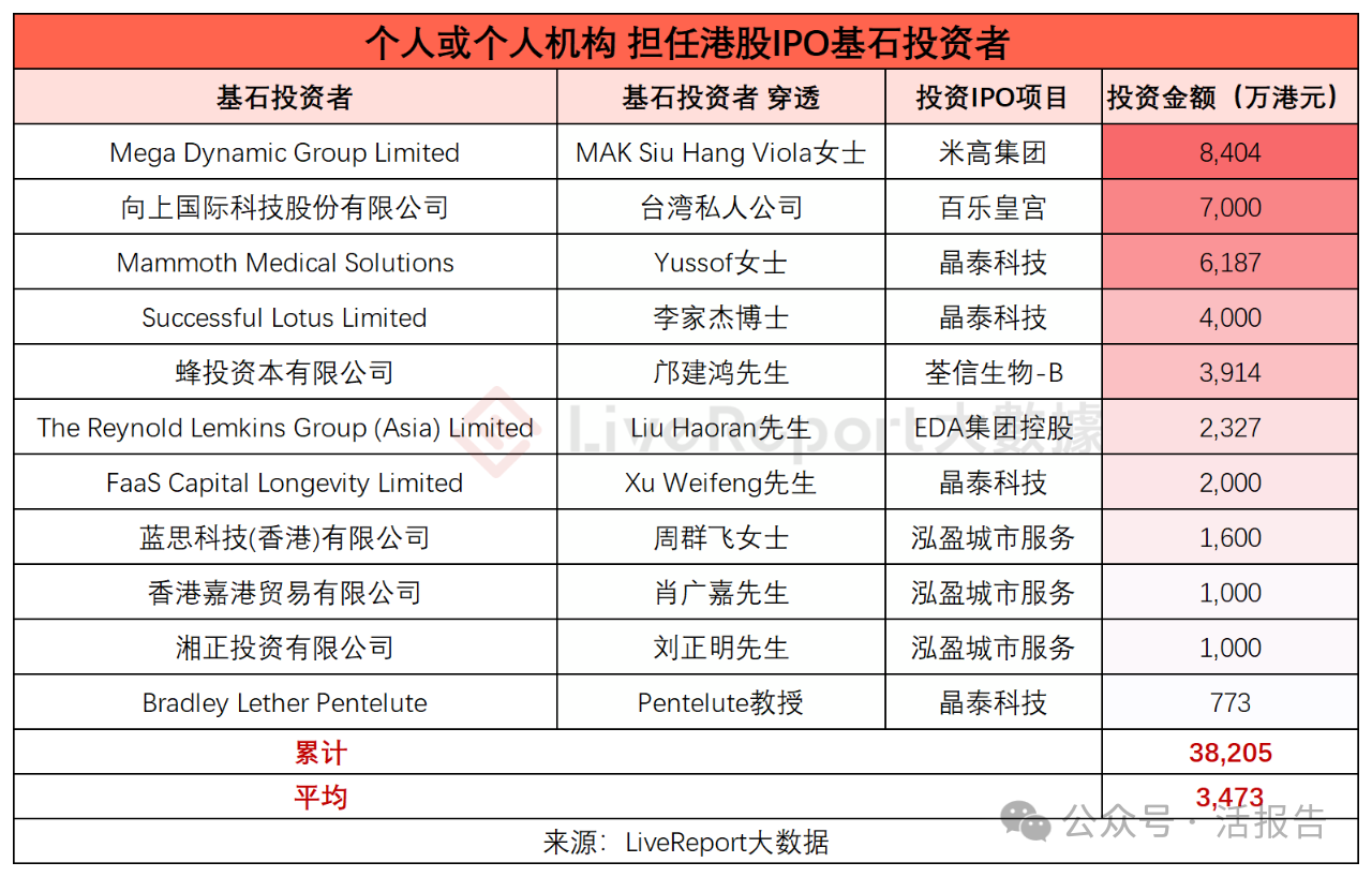2024年至今,有11位势力雄厚的局部,以其局部外面或其全资职掌的局部公司外面介入了港股IPO的基石投资。局部或局部投资机构累计投资金额高达3.8亿港元,均匀单笔投资金额3473万港元。