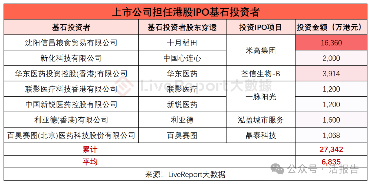 2024年以后,共有7家上市公司介入基石投资,共投资金额为2.7亿港元,均匀每家公司6835万港元。