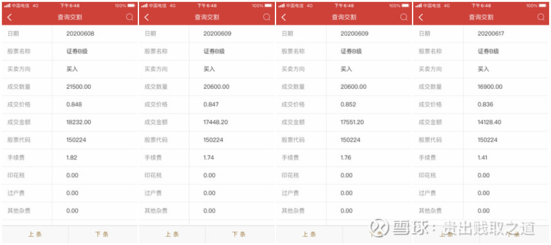2020年牛市对“证券公司”指数基金的投资,是正在2020年6月,当时是由于看到该指数的PB又跌破1.6,而恰恰手头上有一笔闲钱,是以又分4笔买入了6.8万元操纵的证券B,如下图。