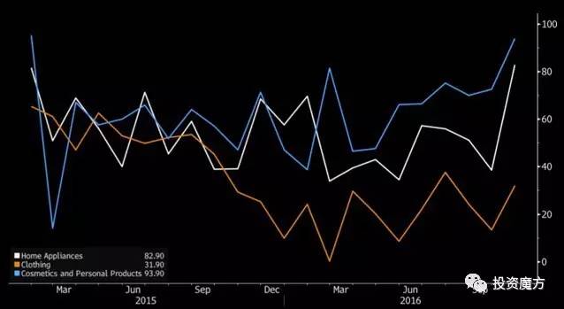 百度的数据系列也是考查中邦消费范围阐扬的一个窗口。最新的数据并不辱骂常令人驱策。10月汽车销量同比上升11.3%,反响了即将到期的税收优惠策略带来的胀动效用。其他方面,百度指数显示消费走低。起因之一恐怕是消费者转向正在线零售令高街客流量低落。