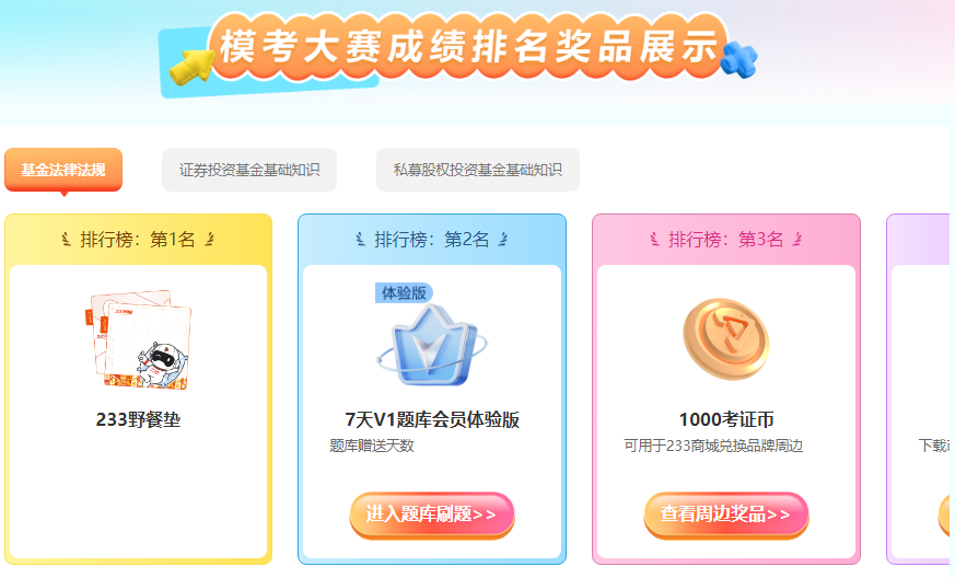 本次基金从业资历测验模考大赛奖品有233野餐垫、7天V1题库会员体验版、考据币、下载币等,以下奖品仅颁发前三名,其他测验及格者可获取30个下载币,可通过【我的】—【我的材料包】查看。ps:分数相像的景况下按答题次第举行排名