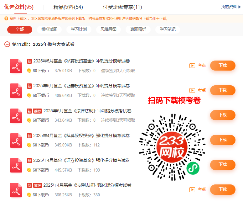 可通过233网校APP--【我的】--【233商城】查看考证币情况;2025/12/20期货交易品种2025年5月基金从业资历【冲刺上分】模考大赛仍旧停止了,本场模考计算了《基金国法规则、职业品德与营业标准》、《证券投资基金基本学问》、《私募股权投资基金基本学问》各一套模测验卷,供给给考友自测评估!目前获奖名单已出来,疾来看看有没有你吧!