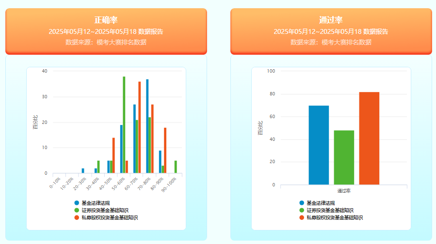 本次基金从业资历模考大赛中,国法规则通过率相对较高,占比70%,私募通过率固然有84%,不过投入人数相对少,结果是证券投资基金基本48%;从精确率来看,景况也差不众,基金国法规则通过率较高,60-70分抵达了27%,其次私募股权投资基金36%,证券投资基金基本学问21%,实在景况如下外: