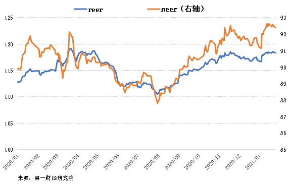 第一财经商量院百姓币外面有用汇率指数(NEER)正在过去一周(1月20日至1月26日)下跌0.13%,收于92.4。剔除了通胀影响的第一财经商量院百姓币现实有用汇率指数(REER)正在过去一周(1月6日至1月12日)下跌0.05%,收于118.4。